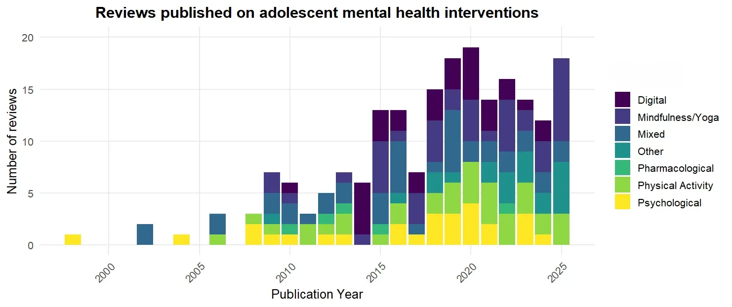 Figure 2. Distribution of systematic reviews on adolescent mental health interventions by publication year and intervention type (psychological, physical activity, pharmacological, digital, mindfulness/yoga, mixed, and other).